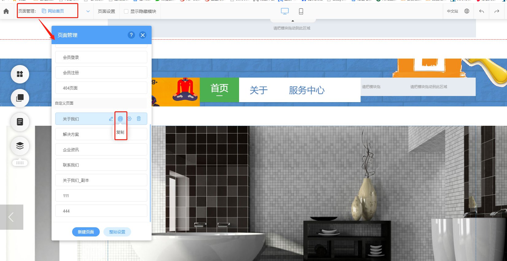 - 再点击页面管理——选择关于我们菜单的复制——选择复制到当前页——确定即可。